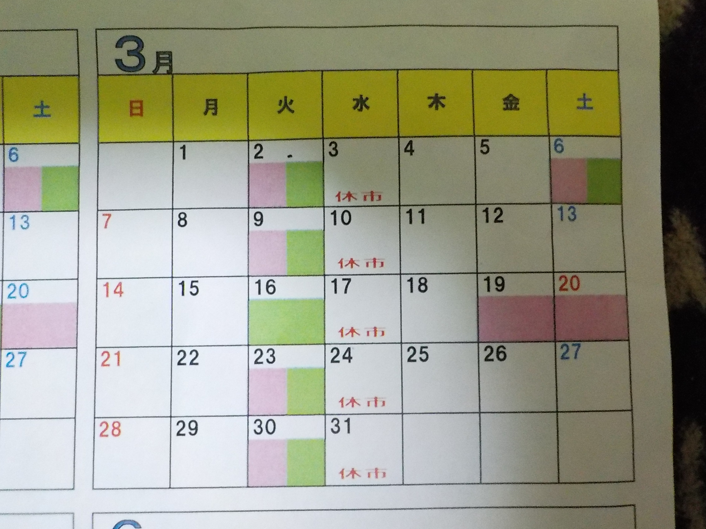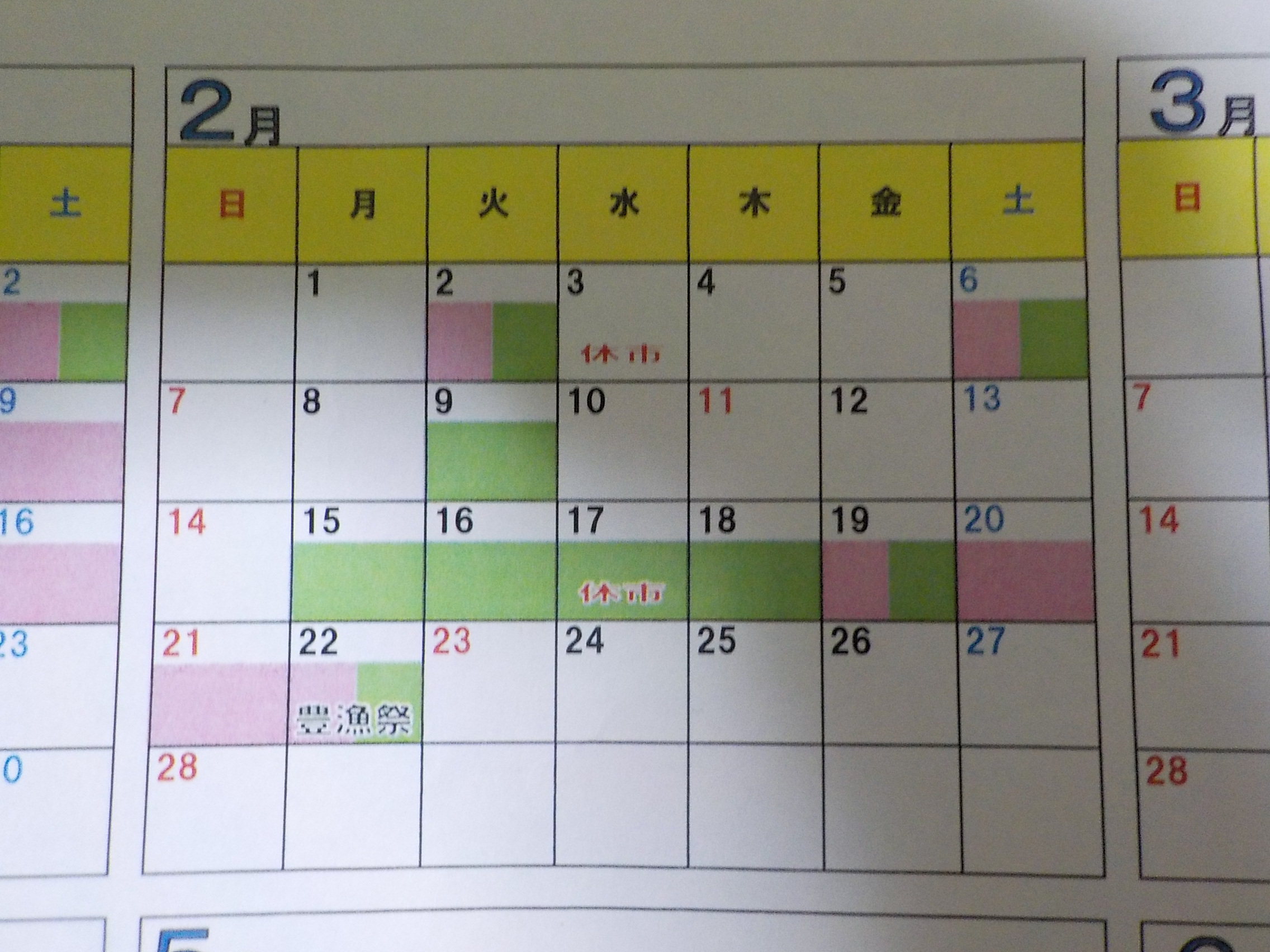 カレンダーの緑色のみ休みです。